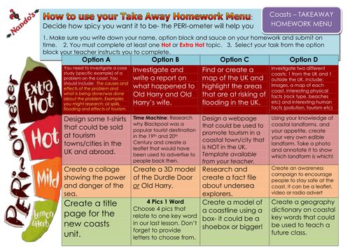 Take Away Homework Choose your homework from the menu below: The Peri-ometer suggests the difficulty or challenge the homework may offer. This term you need to complete at least two ‘EXTRA HOT’ tasks. Title: Microsoft Word - T3 nandos-takeaway-homework.docx ... Fetch Full Source
