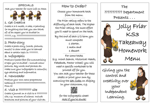 Takeaway (3 points) ‘Takeaway homework menu’ offers students a choice of activities to complete over a number of weeks and can be used for any topic. They must choose a ‘starter’, ... Fetch Full Source